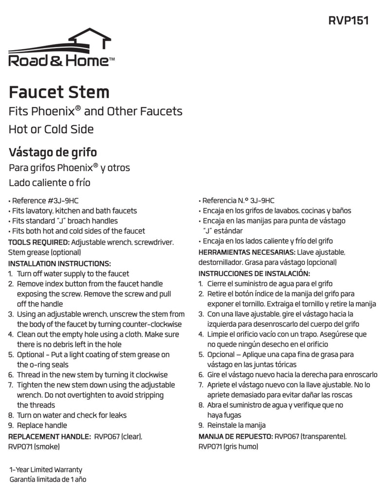 When your faucet drips or leaks around the handle, most time you can avoid the expense and hassle of replacing the entire faucet by replacing the faucet stem. This Road & Home Faucet Stem repairs most Phoenix® faucets which have a J style broach handle. This stem repairs either the hot or cold side. Purchase two to fully overhaul your faucet. Do not waste precious water from a dripping faucet. Repair it today!