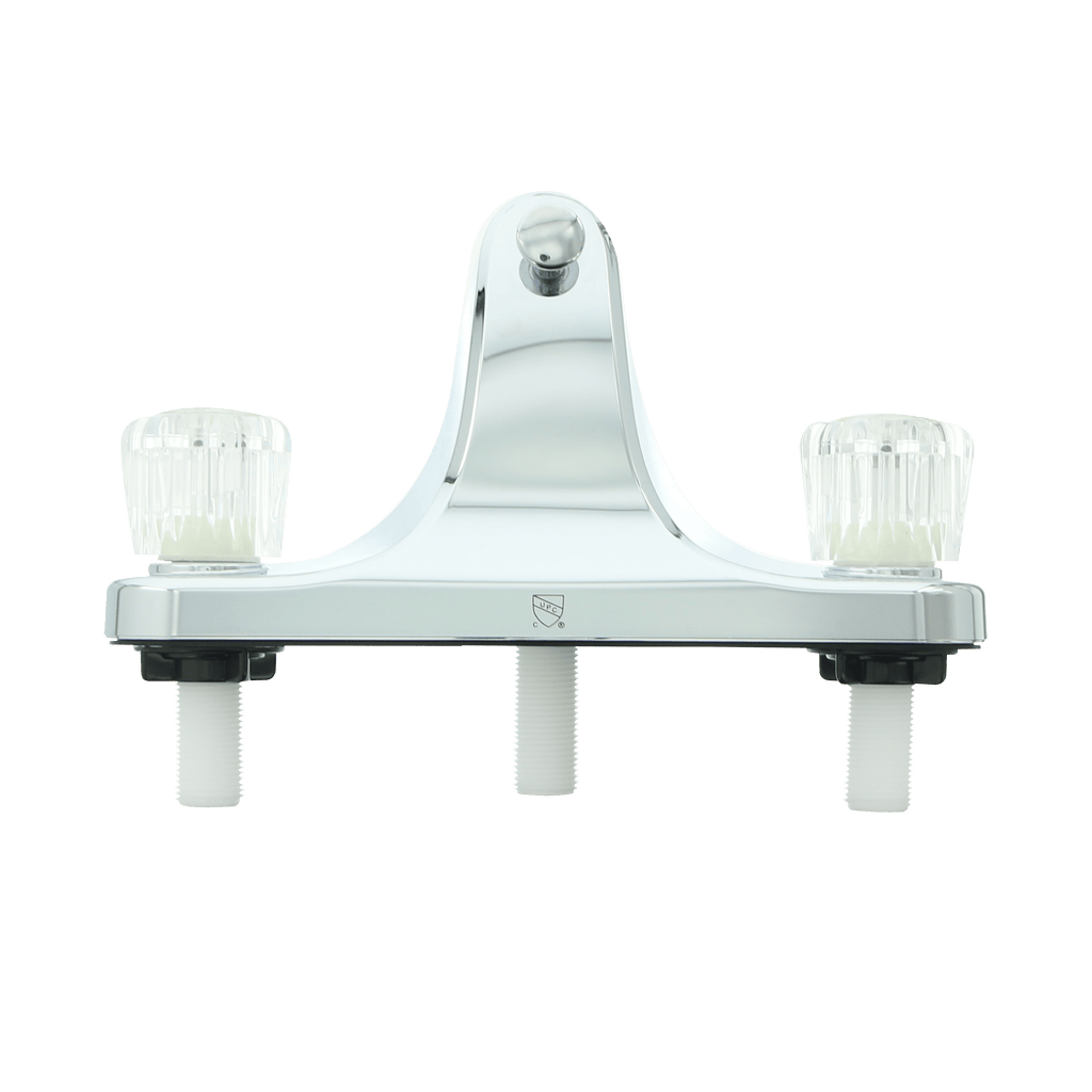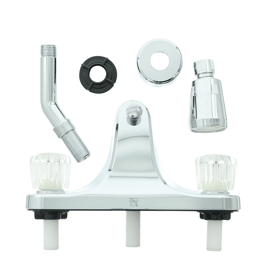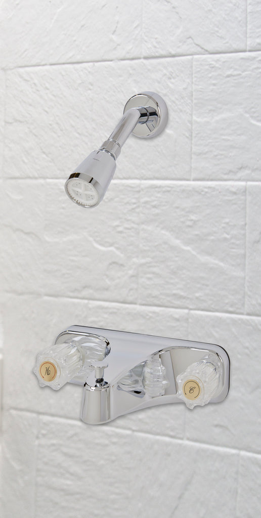 Your tub/shower faucet should be as elegant as your bathroom, without sacrificing any durability or function. Enjoy your bath in style by installing this diverter faucet featuring a full non-metallic construction, chrome polish finish, and contemporary look. It is manufactured specifically to fit the standard 8" recreational vehicle faucet hookup. This particular faucet is designed for an offset water supply, meaning that your water supply should not align horizontally directly with the shower connections. The shower connection is slightly lower (offset) from the water supply inlets. Consider purchasing the straight faucet if you have a shower pipe that is set in line with your water supply connections. Diverter features allow you to switch easily between bath and shower. Use this product as a quality upgrade or as a replacement for a malfunctioning or corroded diverter faucet.