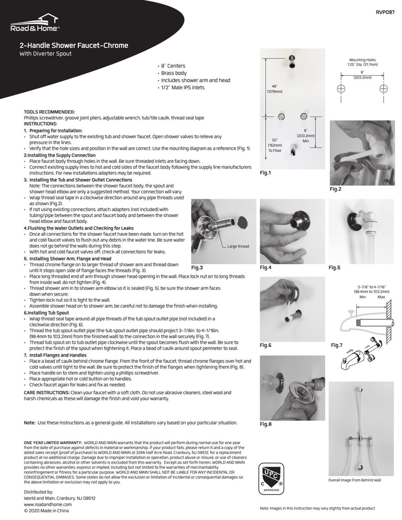 Give your shower an update with chic new fixtures. The Road & Home 2-Handle Faucet is functional and compact. Specially designed for use in an RV and mobile home, this 2-handle shower faucet adds a stylish touch to any decor. The clear acrylic handles are easy to grip. There are separate handles for the hot and cold water which offer precision adjustments, helping you get the temperature just right for the perfect bathing or showering experience. The chrome finish can brighten the room. It's durable and easy to clean. The single function diverter spout is easy to use, just pull up the knob to deliver a full spray for an invigorating shower. The brass body and _ turn washerless stems are durable, adding longevity to the fixtures. Less maintenance may be required over the fixture's lifespan. Simple instructions and use of standard components encourage installation ease. Universal configuration fits most mobile homes and RVs.