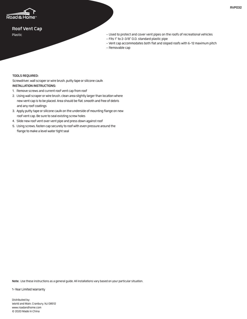 - Easy to install roof vent cap protects RV roof vent stack and interiors from the elements