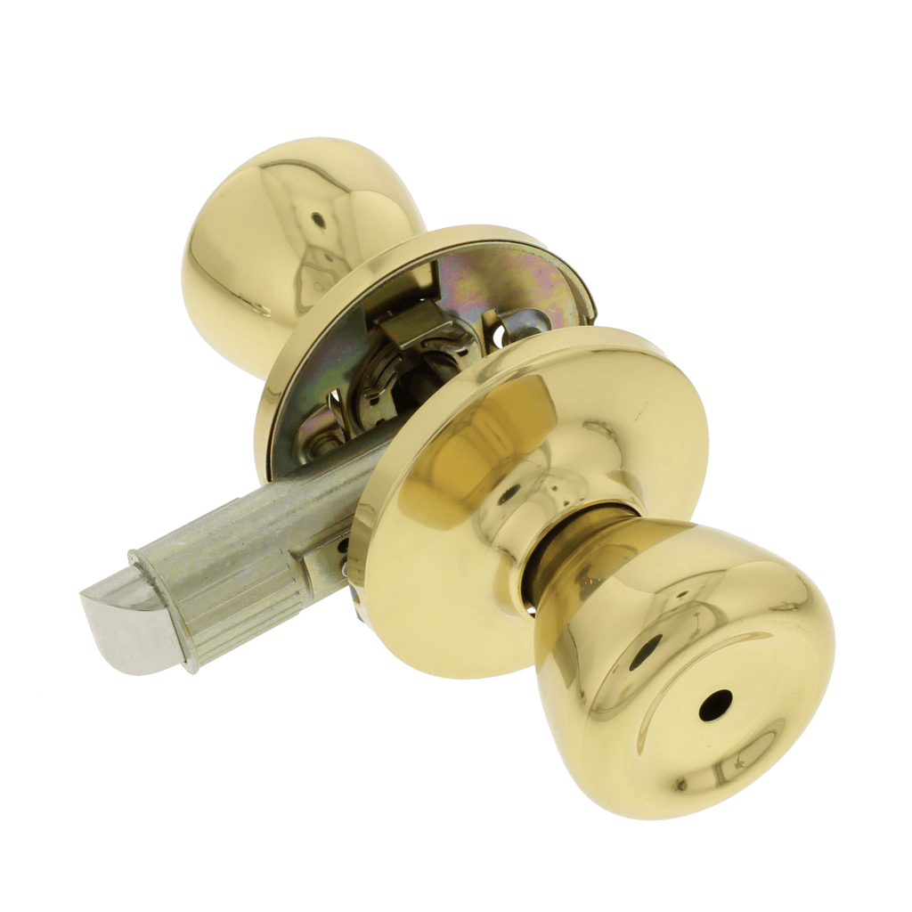 Replace broken or non-locking bedroom or bathroom door locks in your mobile home with this polished brass privacy door lockset. Its 2-3/8 in. backset ensures that it fits most pre-existing interior door holes, and it works on all doors from 1-3/8 in. to 1-3/4 in. in thickness. This set will fit on both left-handed and right-handed mobile home doors. After installation, simply turn the knob for privacy.