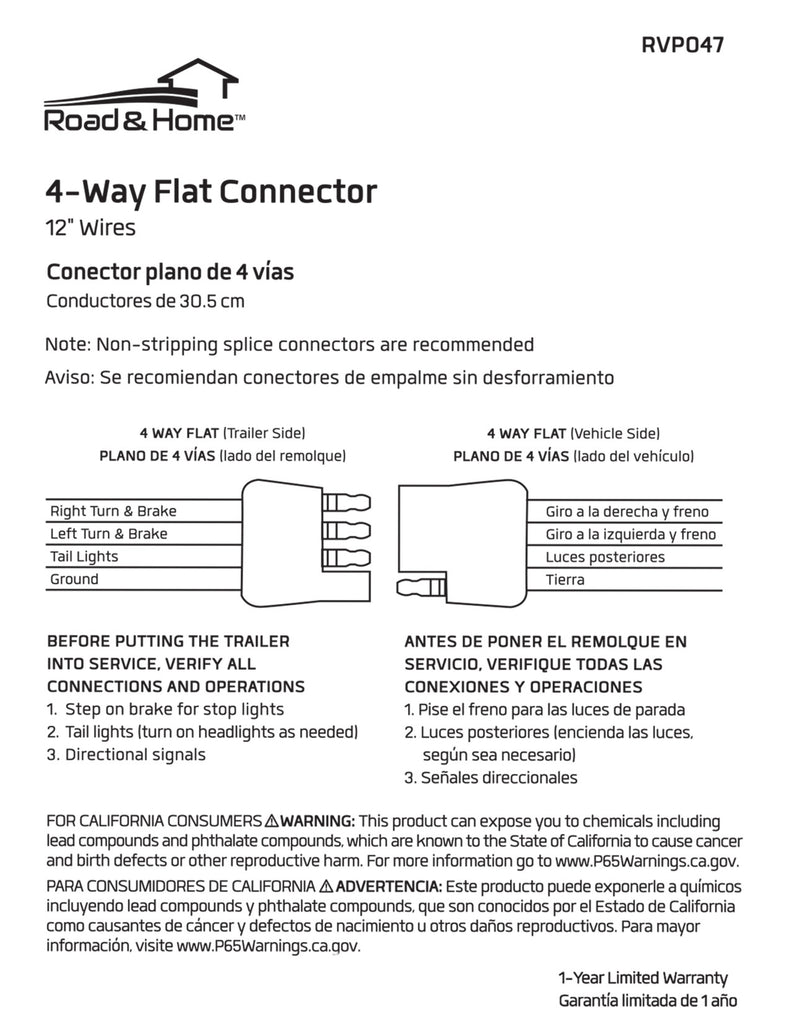 When you plug your trailer into your recreational vehicle or car, you want to know that there will be a reliable connection every time. The Road & Home 4-Way Flat Connector supplies the electrical power needed to allow the turn signals, taillights and brake lights of your trailer to function. This 12 in. wire has a trailer end on one side and a car end on the other to allow you to quickly get your RV ready to tow. The flat connector is designed for outdoor use, so it can stay on your vehicle once installed.