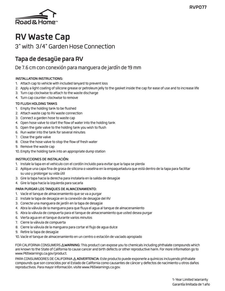 There are a few components on your recreational vehicle that are a top repair priority whenever they start to wear or fail. Your RV waste cap is certainly in this category. A functioning cap is important for containing and managing your wastewater until you come to a stop where you can unload. The Road & Home RV Waste Cap comes with a _ in. garden hose flush attachment with washer to flush out your sewer and gray water system easily and efficiently. When you get back out on the road, close up the cap and reseal the hose connection to contain the waste. This cap is the standard 3 in. size for RV waste systems. Do not run the risk of driving around with a broken waste system. Replace your faulty cap as soon as possible to eliminate odors, allow easier cleaning and preserve hygiene of your immediate environment.