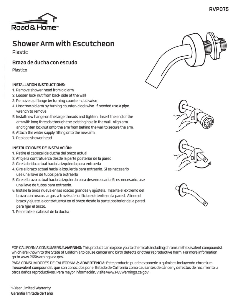 Shower arms are generally one of the more durable parts in a recreational vehicle bathroom. However, they are subject to certain forces, especially corrosion. Additionally, you could damage your shower arm by hanging items from it or when installing or removing a particularly stubborn showerhead. If you are replacing a showerhead, then it is the perfect time to install a new shower arm and escutcheon set. The Road & Home Shower Arm and Escutcheon set is designed for maximum durability, even in steamy conditions. Its standard size fits most standard showerheads and hookups. Avoid premature breakage and corrosion and enjoy a new leak-free attachment.